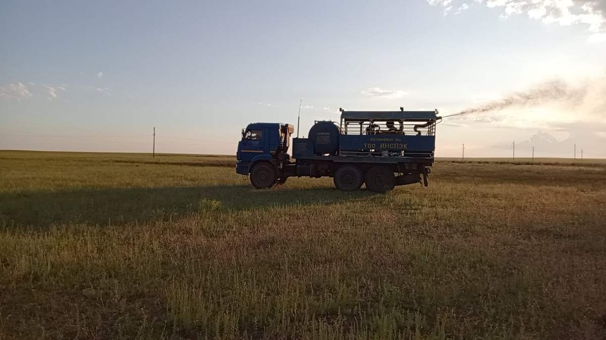 — На сегодняшний день по Костанайской области химические работы ведутся в 6 районах. Для борьбы с саранчовыми вредителями задействована 51 единица техники, в том числе легкая авиация (самолеты), сверхлегкая авиация (дельтапланы), аэрозольные газогенераторы, наземные вентиляторныеопрыскиватели, наземные штанговые опрыскиватели, — рассказали в костанайской областной территориальной инспекции Комитета государственной инспекции в агропромышленном комплексе МСХ РК.