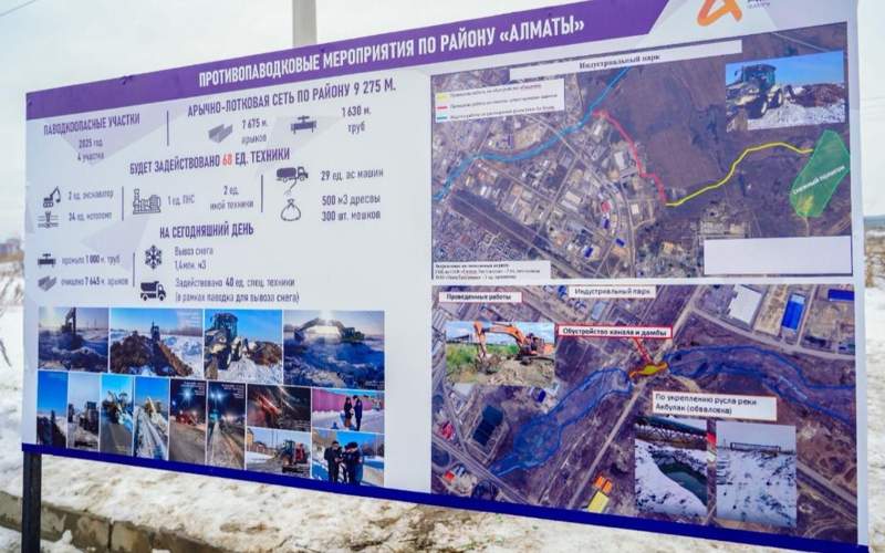В рамках мероприятий по предотвращению подтоплений ведется очистка и расширение русел рек и арыков. Как сообщил аким, в индустриальном парке района «Алматы» проводится очистка русла ручья Акбулак и устройство обводного канала, что увеличит пропускную способность во время весеннего таяния снега. Дополнительно принимаются меры по защите водозаборной насосной станции в районе Тельмана.