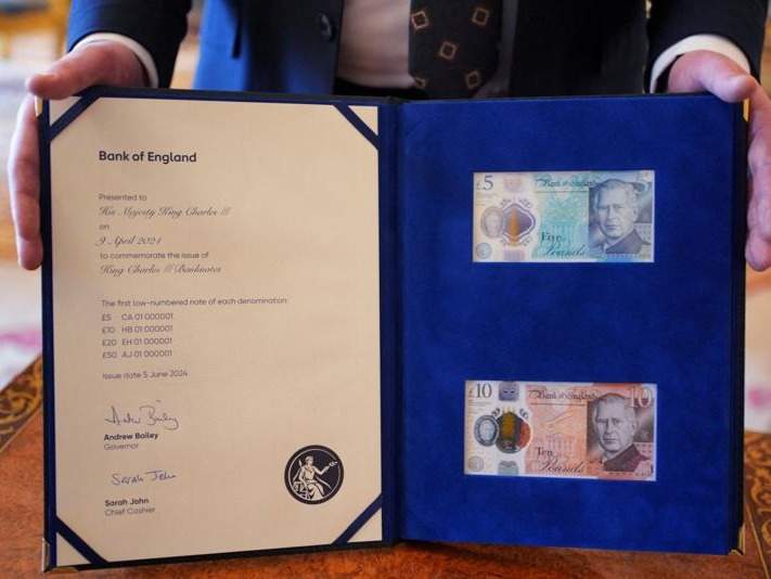Управляющий Банка Англии Эндрю Бэйли и главный кассир Сара Джон вручили королю первые банкноты с его изображением в Букингемском дворце. Отныне новый монарх будет присутствовать на всем имеющемся в обращении номинале: банкнотах в пять, 10, 20 и 50 фунтов.