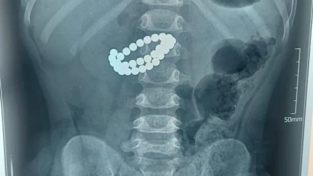 Қабылдау бөліміне 1 жас 9 айлық бала өте ауыр жағдайда жеткізілген. Тексеру нәтижесінде дәрігерлер «ішектегі бөгде заттар – 31 магнит, жіңішке ішектің көп жерден тесілуі, перитонит» диагнозын қойды.
