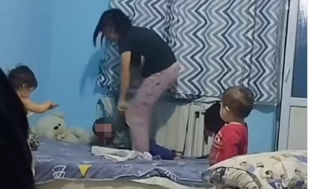 Жантүршігерлік бейнежазбаны журналист Жанар Нұртазина жариялаған, онда әйелдің баланы аяусыз ұрып жатқанын, тіпті басынан тепкенін көруге болады.