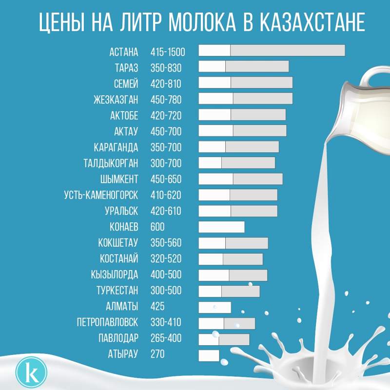 В Кызылорде, Усть-Каменогорске, Астане, Уральске, Семее, Актобе, Алматы, Актау, Жезказгане минимальная цена на молоко составляет 400-450 тенге за литр. В Астане, например, можно купить пачку ультрапастеризованного молока жирностью 3,2% за 1 500 тенге, жирностью 6% — за 900 тенге, безлактозное — 910 тенге. В Конаеве литр молока обойдется в 600 тенге.