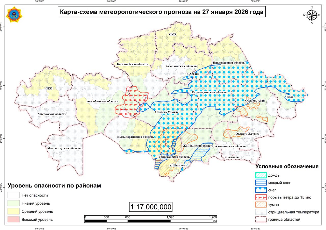 Астана. 27 января. BM.KZ – Синоптики рассказали, в каких регионах объявлено штормовое предупреждение.