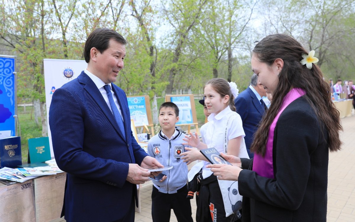 Глава региона посетил выставку и пообщался с детьми о книгах. Нескольким маленьким актюбинцам он специально купил книги в местных книжных лавках и подарил их.