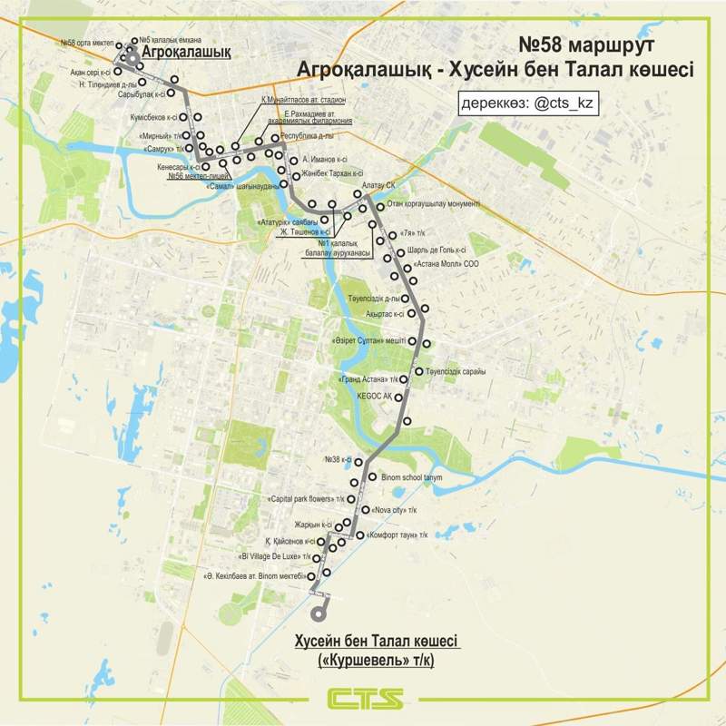 Маршрут охватит Национальный музей РК, Дворец школьников им. аль-Фараби, мечеть «Хазрет Султан», Монумент защитников Отечества, мкр. Самал, пр-т аль-Фараби (ЖК «Nova City», «Comfort Town», «Capital park. Flowers», «Zhana Omyr»).