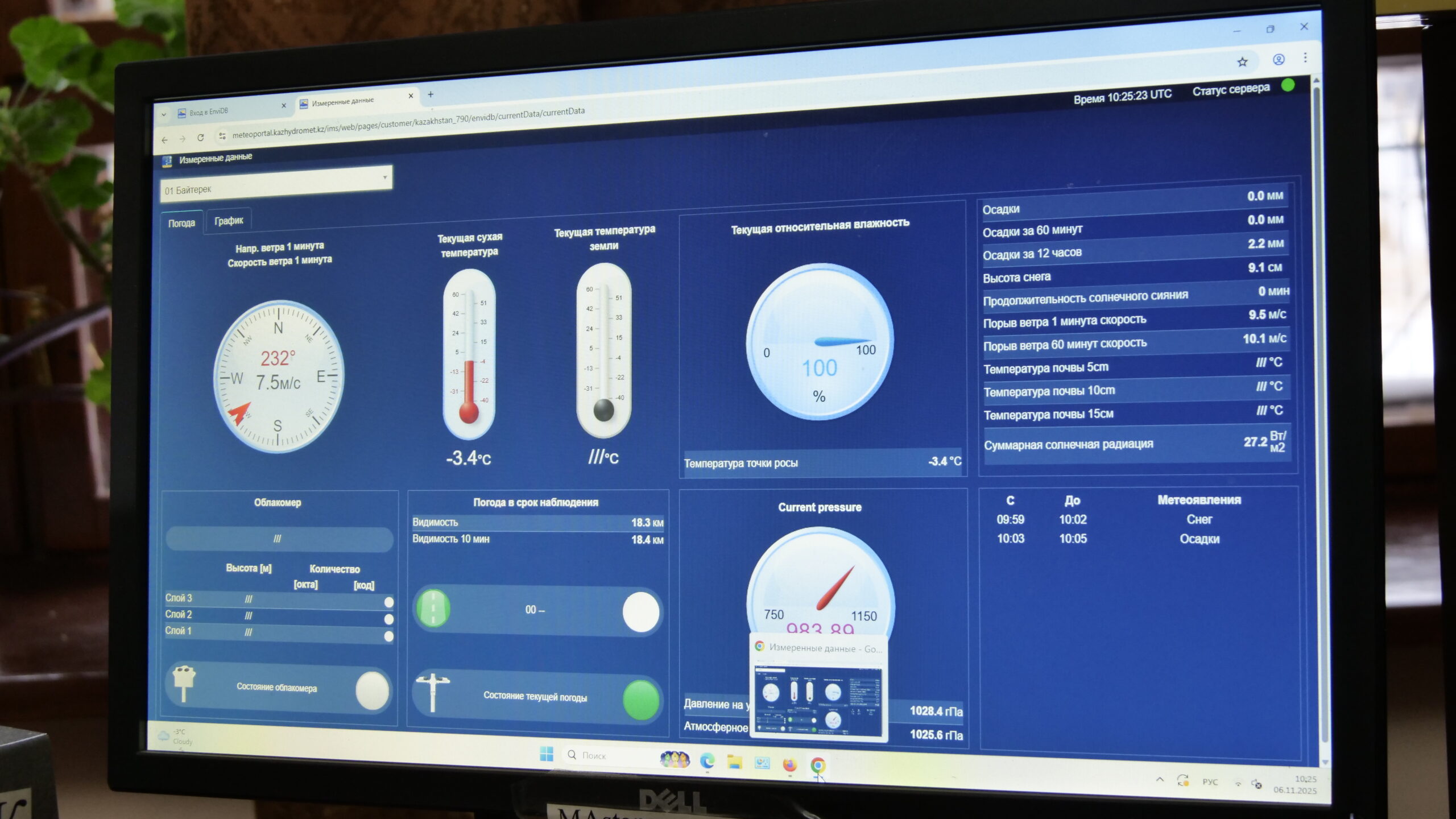 АМС показывает осадки, температуру воздуха, ветер, влажность, давление, скорость ветра каждую минуту и максимальный порыв ветра каждый час.