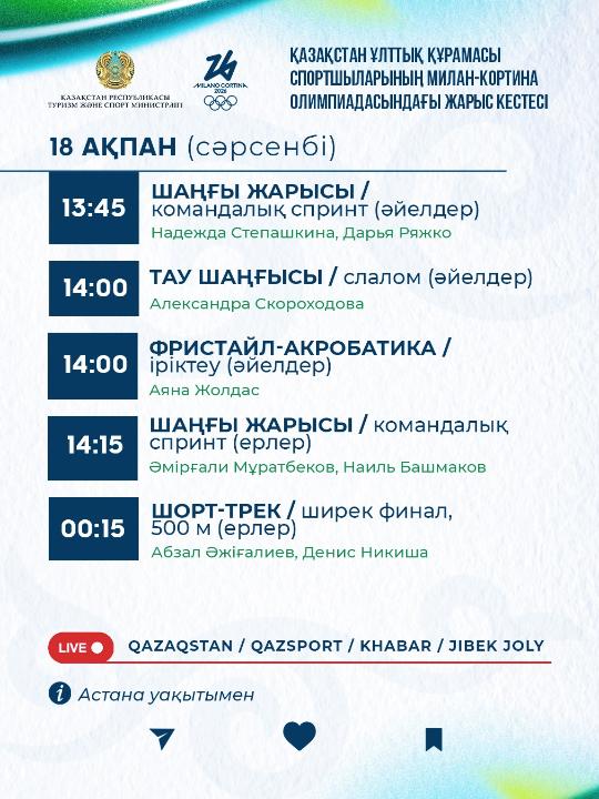 Астана. 18 февраля. BM.KZ – Стало известно расписание стартов на 18 февраля на Зимних Олимпийские игры в Милане и Кортина-д’Ампеццо-2026. Зимняя Олимпиада Олимпиада спорт