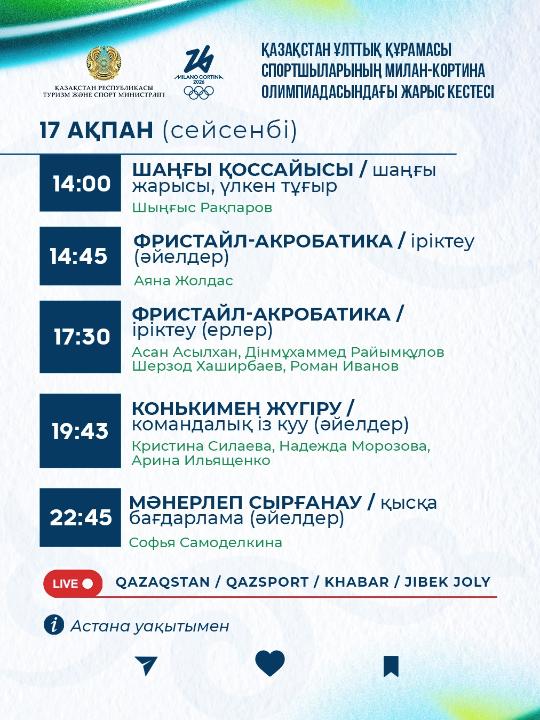 Астана. 17 февраля. BM.KZ – Стало известно расписание стартов на 17 февраля на Зимних Олимпийские игры в Милане и Кортина-д’Ампеццо-2026. Зимняя Олимпиада Олимпиада спорт