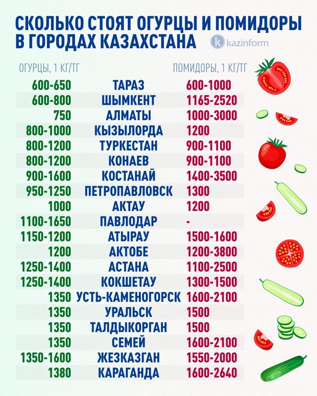 В Усть-Каменогорске, Талдыкоргана, Уральске и Семее огурцы стоят 1350 тенге.