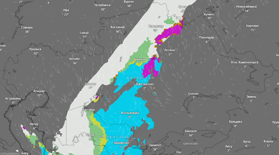 5 февраля 2026 года в Акмолинской, Северо-Казахстанской, Кызылординской, Актюбинской, Мангистауской, Туркестанской, Карагандинской, Павлодарской и Костанайской областях, а также в области Улытау местами ожидаются снег и метель.