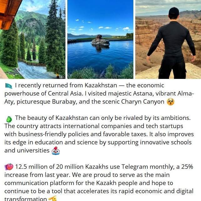 — Недавно я вернулся из Казахстана — экономического центра Центральной Азии. Я посетил величественную Астану, оживленный Алматы, живописные Бурабай и Чарынский каньон. С красотами Казахстана могут соперничать только амбиции страны. Казахстан привлекает международные компании и технологические стартапы благоприятной для бизнеса политикой и выгодными налогами. Страна также улучшает свои преимущества в сфере образования и науки, поддерживая инновационные школы и университеты, — сообщил Павел Дуров.