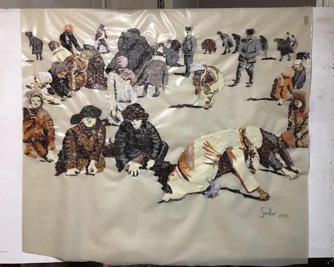 Все началось еще с серии «Казахская хроника». Сперва серия была сделана в технике гратографии, то есть восковой гравюры на бумаге. Это было с 2004 по 2008 год, получается больше 20 лет тому назад. С 2008 года работала в технике живописи на фотографии. С 2018 года я начала «Қалдық естелік. Остаточная память». Эта серия уже была выполнена из пакетов.