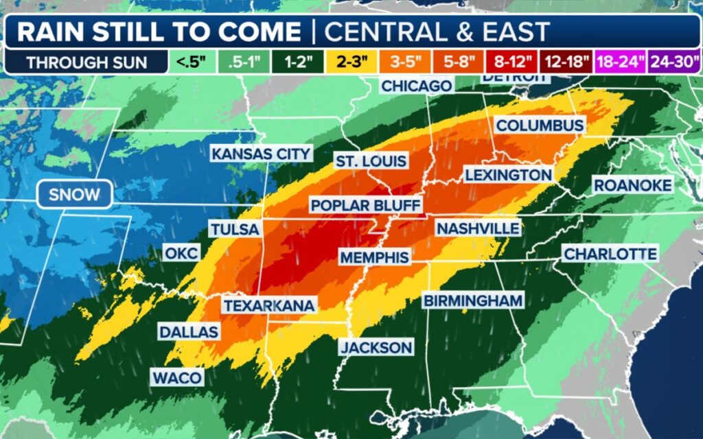 сильные дожди ожидаются в Арканзасе и Теннесси.