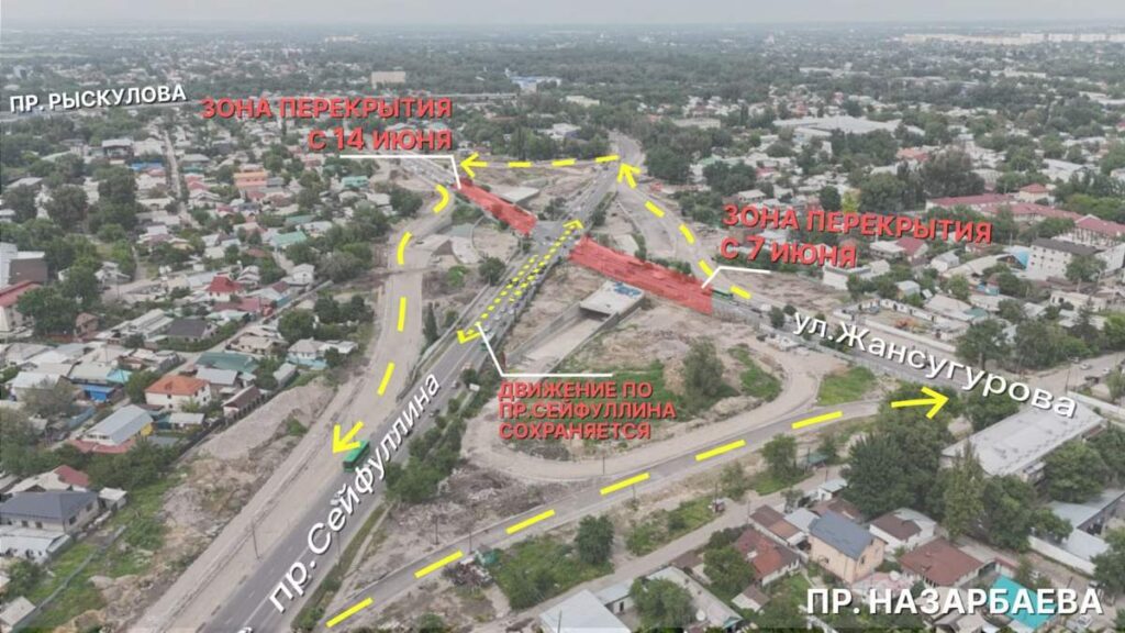 С 14 июня будет ограничено движение транспортных средств по улице Жансугурова севернее проспекта Сейфуллина. Движение будет обеспечено по съездам. Данная схема будет действовать до 1 сентября.