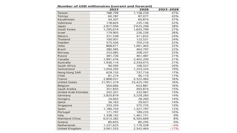 «В Тайване это увеличение может достигнуть 50%. Два заметных исключения (то есть уменьшение числа миллионеров) ожидаются в Соединенном Королевстве и Нидерландах»