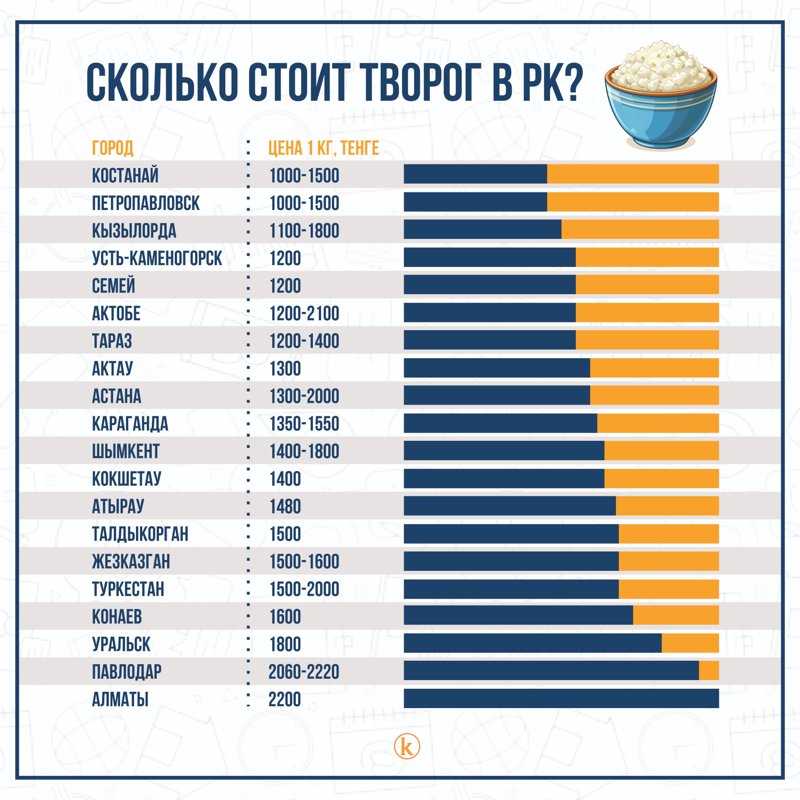 От 1200 тенге цена на творог стартует в Усть-Каменогорске, Семее, Таразе и Актобе (к слову, в Актобе магазинный вариант обходится дороже – 2100 тенге за килограмм, чем домашний), 1300-2000 тенге – в Астане.