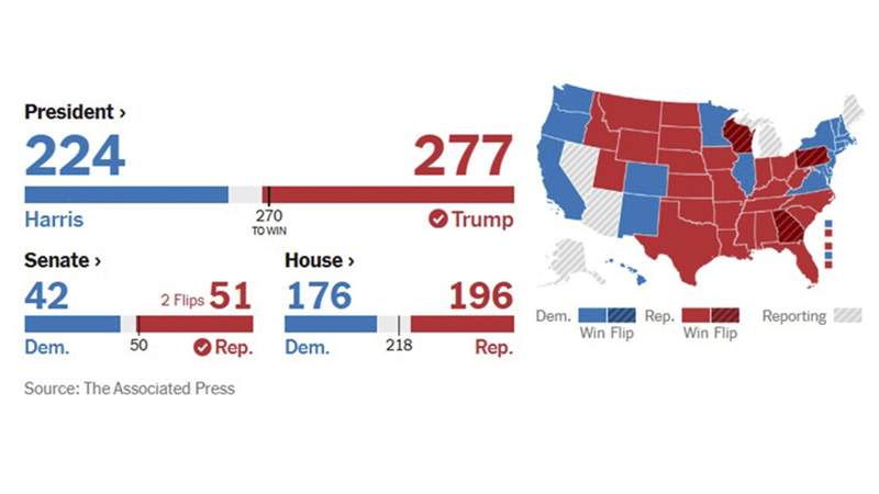 Кандидат от Республиканской партии и бывший президент США Дональд Трамп получил 277 голосов коллегии выборщиков из необходимых 270 для победы на выборах, передает собственный корреспондент агентства Кazinform, со ссылкой на The New York Times.