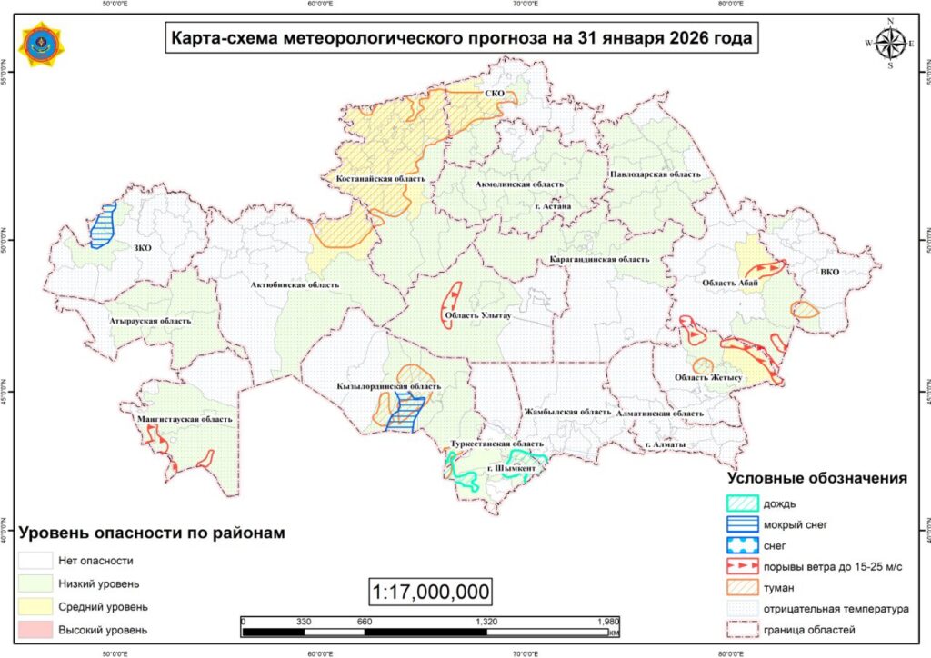 Астана. 31 января. BM.KZ – Синоптики сообщили о штормовом предупреждении по Казахстану на воскресенье.