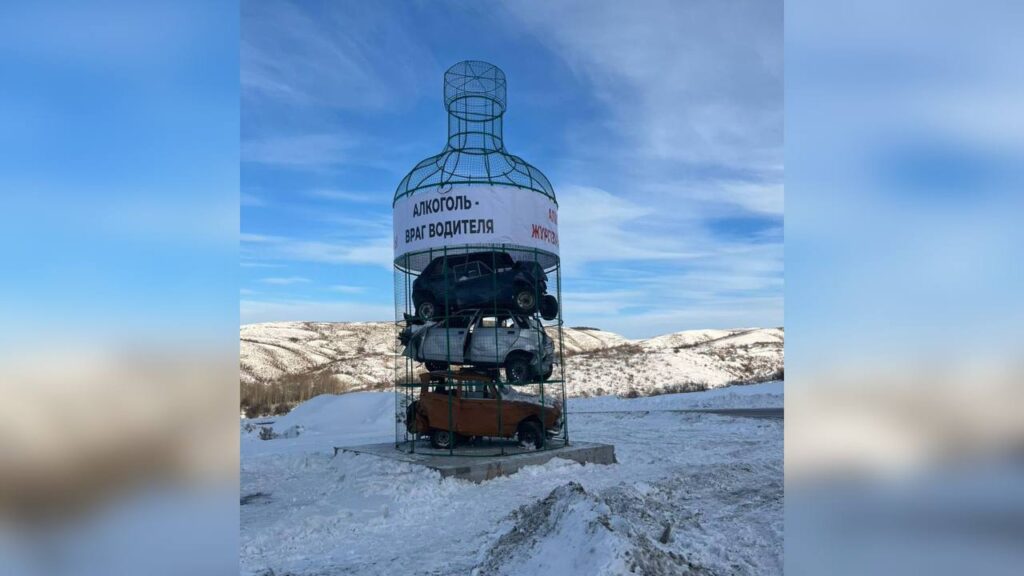 На трассе Усть-Каменогорск – Алтай – Рахмановские Ключи появился профилактический арт-объект — девятиметровая бутылка с размещенными внутри искореженными авто, участвовавшими в тяжелых ДТП.