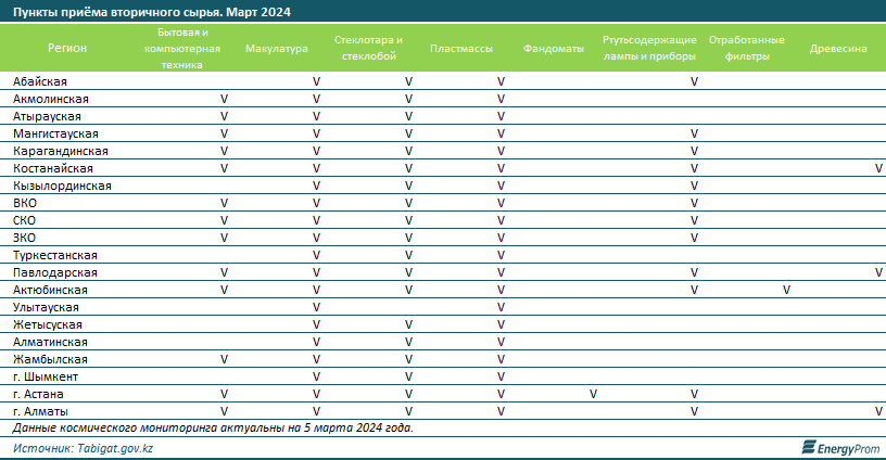 На этапе переработки свои сложности. Из-за низкого уровня раздельного сбора ТБО (хотя бы по фракциям «мокрые» и «сухие»), их сортировка проводится вручную. Доля мусора, пригодного для переработки, остаётся небольшой. Бизнесу на этапе сортировочных линий интересно изымать только то вторсырьё, которое возможно переработать или продать. Как правило, это бутылки ПЭТ и другие полиэтиленовые изделия, макулатура, бытовая и компьютерная техника, шины. Предпринимательский интерес к рынку вторсырья можно проследить по интерактивной карте пунктов приёма, публикуемой Национальным банком данных о состоянии окружающей среды Tabigat.gov.kz при МЭПР РК. По данным на 5 марта 2024 года, в каждом регионе и мегаполисе есть пункты приёма пластмассы и макулатуры. Бытовую технику можно сдать только в 13 из 20 регионов страны, древесину — всего в трёх, отработанные фильтры — лишь в Актюбинской области. Фандоматы пока установлены только в Астане.