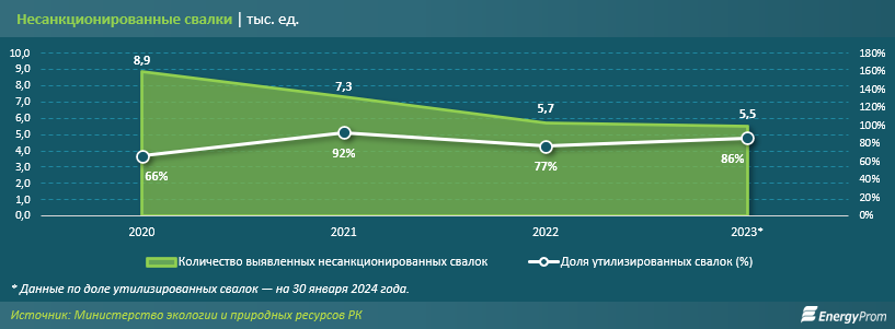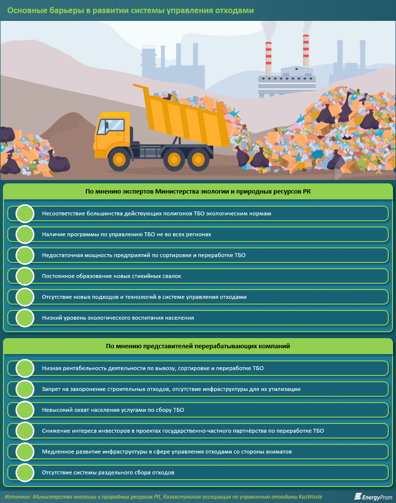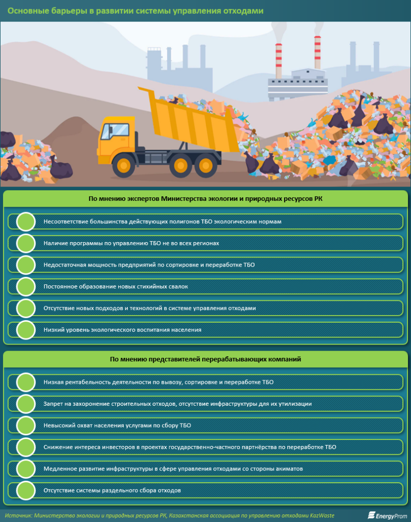 Вторая большая проблема — медленное развитие инфраструктуры. По словам министра экологии и природных ресурсов РК Ерлана Нысанбаева, озвученным им на площадке Службы центральных коммуникаций 5 февраля, в настоящее время в стране не хватает 82 тыс. контейнеров. Коммунальные предприятия в крупных городах рапортуют о том, что им недостаточно техники для вывоза мусора. И главное: в стране лишь небольшая часть мусорных полигонов построена по современным стандартам экологической безопасности. Из 3 тыс. полигонов только 20,6% соответствуют санитарным нормам. Остальные или переполнены, или не узаконены, или используют устаревшие методы уплотнения мусора.