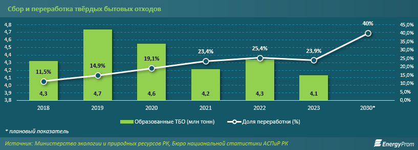 После пересчёта общереспубликанского показателя в 2023 году оказалось, что достичь запланированных 27% к концу периода не удастся. В итоге доля переработки не выросла, а даже уменьшилась. Что касается объёмов собранных отходов, они незначительно сократились. За прошлый год в Казахстане собрали 4,1 млн тонн ТБО (минус 4,7% к 2022-му).