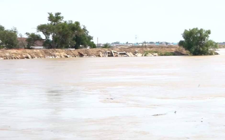 — Дежурный состав, контролирующий уровень воды на берегу реки Жайык у села Акжар, около 4 часов утра заметил, что часть дамбы размывается водой и грозит прорывом. Мы совместно с сотрудниками ДЧС приступили к работе по оперативному укреплению дамбы. Укладываем геомембрану и насыпаем дополнительный грунт. Площадь дамбы, размытой течением, составляет 100 м. Мы планировали защитить укрепления шиферным кровельным материалом. Однако глубина уровня воды намного выше самих укреплений, установить их не удалось, — рассказал координатор участка 69-73 Кахарман Рахметулы.